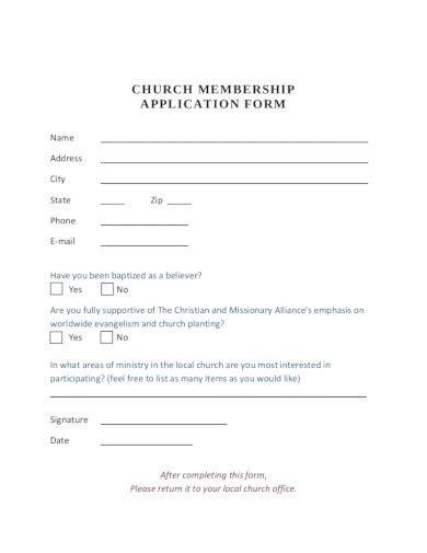 A church membership form template is a great way to help churches maintain accurate records of their members and their information. This template is easy to use and helps churches to quickly and easily collect important information. This template also helps churches to easily track changes in membership and to better serve their members. Using a church membership form template is a great way to ensure that churches are organized and that they have the necessary information to effectively communicate with their members.